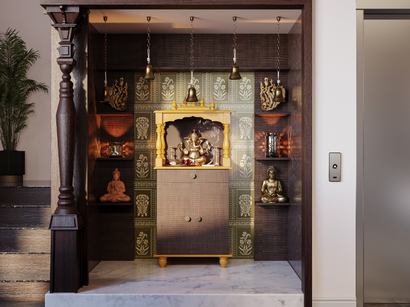 With carved pillars, floating shelves, and temple-style bells, this pooja unit design brings home quiet divinity. The mural backdrop and warm wood tones blend right into your decor, while modular shutters below keep clutter tucked away. A space that feels like a temple, fits like a modern home—ideal for Indian homes that value grace and meaning.