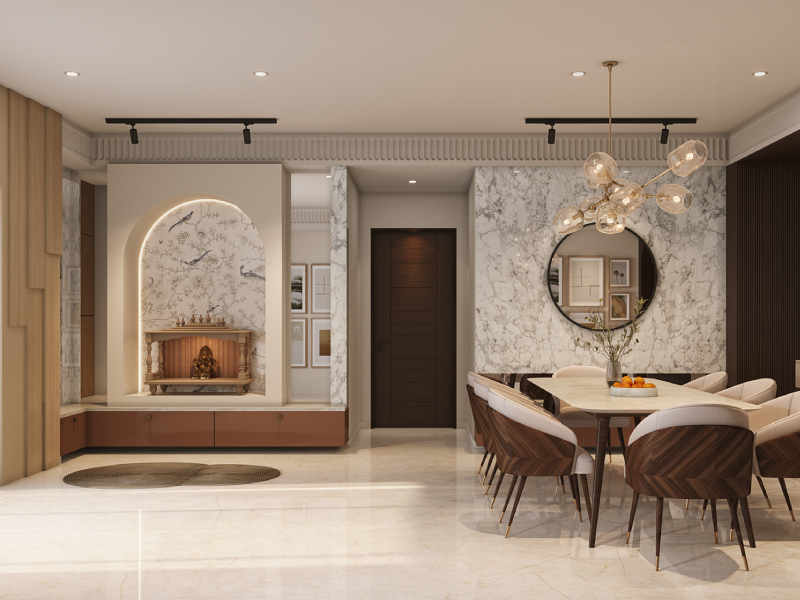 This pooja room design blends traditional temple elements—like pillars and a subtle spire—with a clean, modular base. The carved arch and soft lighting add serenity, while the compact unit stays clutter-free. A seamless fit in modern Indian homes, this mandir design brings quiet divinity without disrupting your everyday flow.