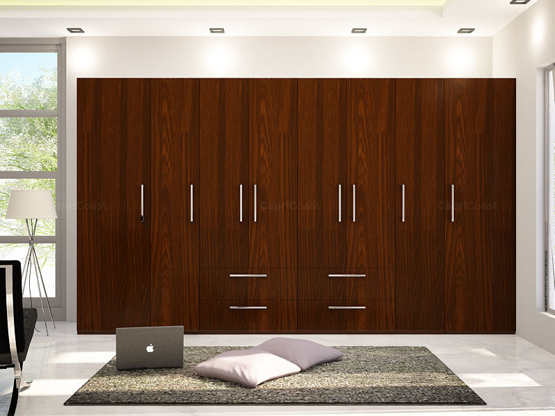 Shades of rich brown wood are layered against white in this lovely modular bedroom, making a calm setting for a peaceful night’s sleep. Dark wood beautifully complements larger spaces like in this spacious bedroom, lending pattern and deep colour to an otherwise neutral palette. Simple steel handles add functional aesthetics to the wardrobe design.