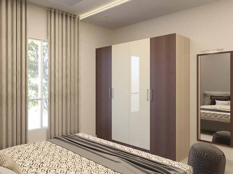 Sumptuous wooden grains pair easily with glossy cream, to create this functional 4-door hinged bedroom closet. The mirror on the wall alongside can be fitted with drawers below for additional storage. The drapes and bed linen pick up the colour narrative, and add a good dose of texture to dial up the visual quotient.