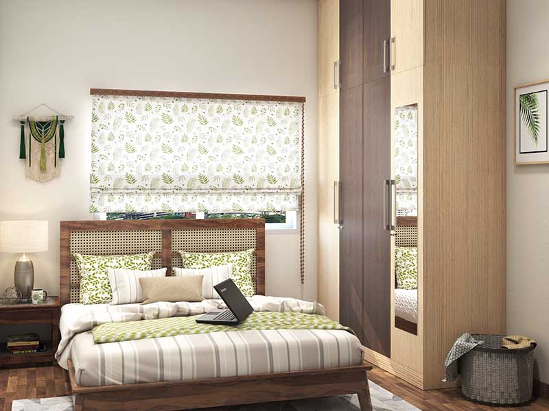 Muted leafy patterns in pastels evoke a sense of peace in this bedroom theme, with biophilic prints on the walls and patterned bed linen continuing the commune with nature. Dark and light coloured wood laminates blend together in the simple hinged straight wardrobe that combines beauty with functionality.