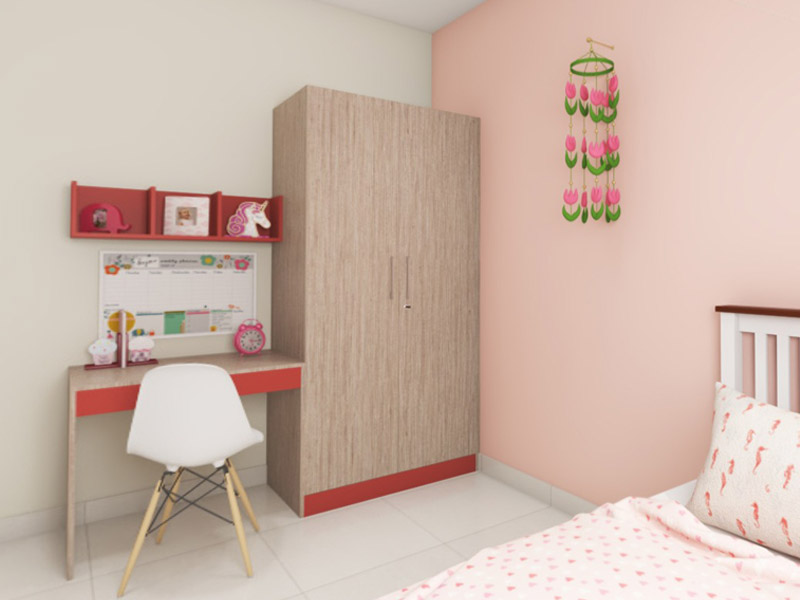 Love the energy of red, but don’t want it to dominate your little one’s bedroom? Tone down its brightness by using it in combination with white cedar wood. This compact bedroom closet gets the colour pairing just right; with the lovely grains of white cedar standing out in stark contrast to the vivid red skirting just off the floor. The study desk alongside the wardrobe is sleek and functional, with colour-blocked, bright red overhead shelves for toys and books.