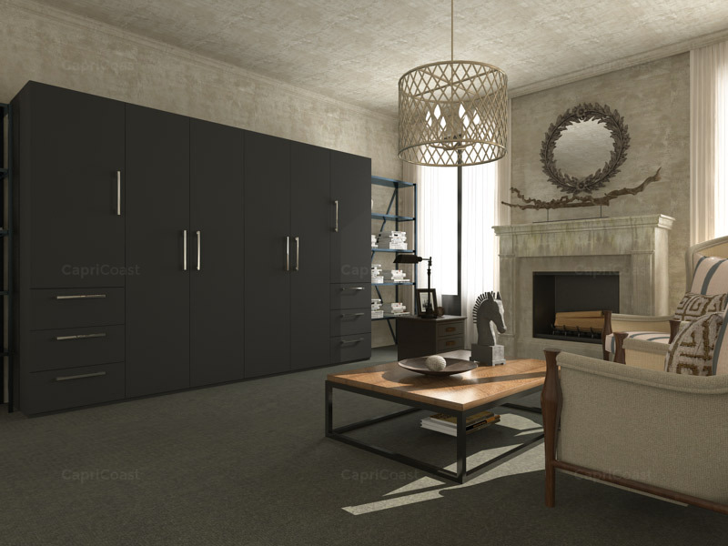 Love a dark, edgy vibe? That’s just what this all-black modular wardrobe design is all about! Rethink your bedroom’s colour narrative by opting for this cool, chic black-and-cream combo.The visual impact of this dramatic black wardrobe grabs eyeballs, making a strong impact that is softened by the textured cream walls and ceiling.