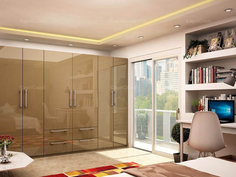 Clay brown lends an earthy vibe to this simple, straight modular wardrobe design. Colour-matched to creamy vanilla in the rest of the room, this palette makes for a warm and inviting bedroom that exudes stability and grounding. Add pops of vibrancy in the accents and accessories all around.