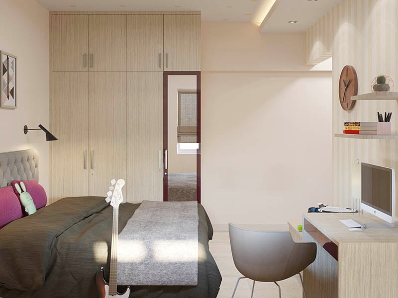 An all-white bedroom theme will never go out of style! Fresh and bright, and well suited to both large and small rooms, this white wood wardrobe is every home owner’s dream come true. You can choose to add a mirrored panel and make it double up as a dresser, if space is a constraint. The loft adds valuable extra storage space.