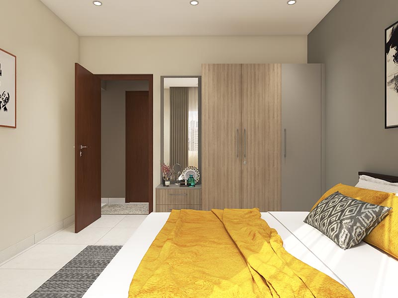 Shades of grey are known for inducing calm and inner peace, which is why grey is the perfect colour pick for a modular bedroom! White cedar shutters create subtle contrast to the shades of grey in this hinged straight wardrobe. The yellow colour-blocked bedcovers add a dash of cheerful vibrancy to elevate the ambience.