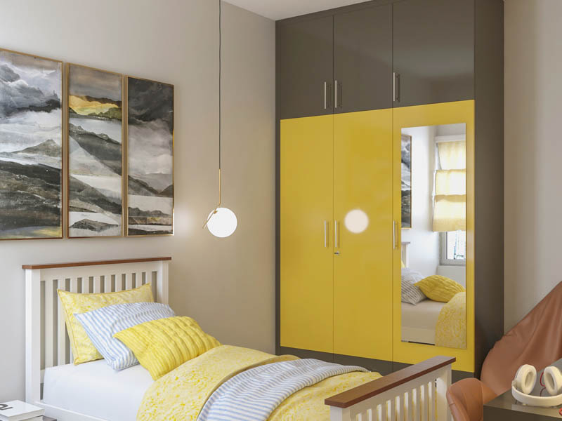 Recreate the ambience of a sunshine-filled morning with this perky mustard and grey bedroom closet. This much-loved colour pairing has made it to the top of every designer’s lookbook, and we’re sure you’ll fall in love with this look, too! Colour-match the bed covers and accessories in the room for some sunny cheer. The mirror on the wardrobe door is a very useful addition to a compact bedroom.