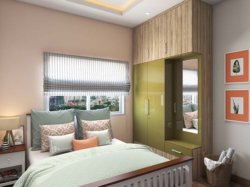 An unusual shade of henna green pairs with textured wood for a dramatic effect in this master bedroom wardrobe. The rest of the room is painted with orange, green and beige accents for a masterful canvas. The mirror and dressing unit to one side of the wardrobe offer additional value and utility.