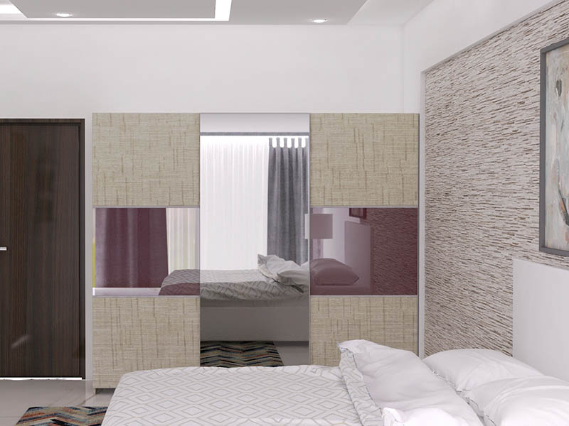 A glossy purple panel adds a shot of unexpected colour to the textured beige sliding wardrobe, weaving its own special brand of magic in this modern modular bedroom. The mirrored panel in the middle makes the room appear more spacious, reflecting and bouncing around the light streaming in from the windows.Concealed handles add to the minimalistic feel.