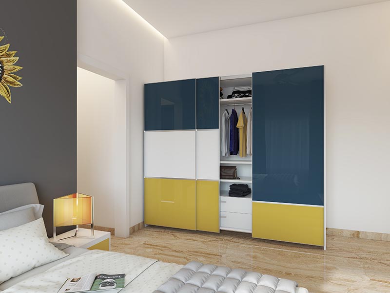 Get beachside holiday vibes all year long, with this lovely trio of sea green, sunny yellow and white in your bedroom! Vibrant and colourful, this 3 door wardrobe design exudes energy, making sure that you always wake up in a good mood. You can custom-design the wardrobe internal design to match your storage requirements.