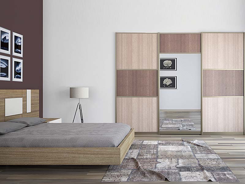 A much-loved shade in every interior designer’s arsenal, brown works well with various wooden accents in the room. This bedroom experiments with contrasting colours of wood to create visual interest, keeping the look simple and sweet without being boring. The wood-panelled sliding shutters in the modular bedroom wardrobe feature a mirrored panel that visually enhances the space.