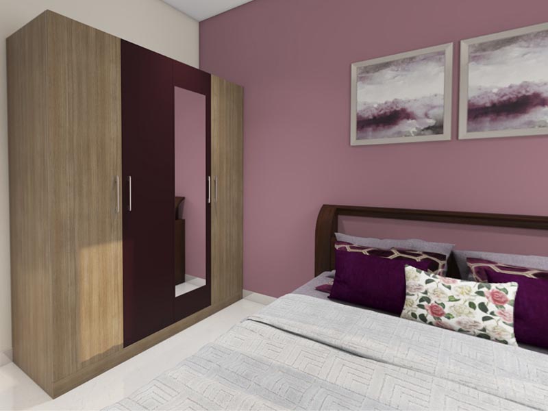 Calming hues of dusky rose provide the ideal backdrop for a restful space in this modern luxury bedroom, with soft florals and pastels continuing the theme.The 4-door hinged wardrobe features shutters in light wood and dark chocolate, with a mirrored panel adding convenience. Wardrobe internal designs can be tailored to suit your storage needs.
