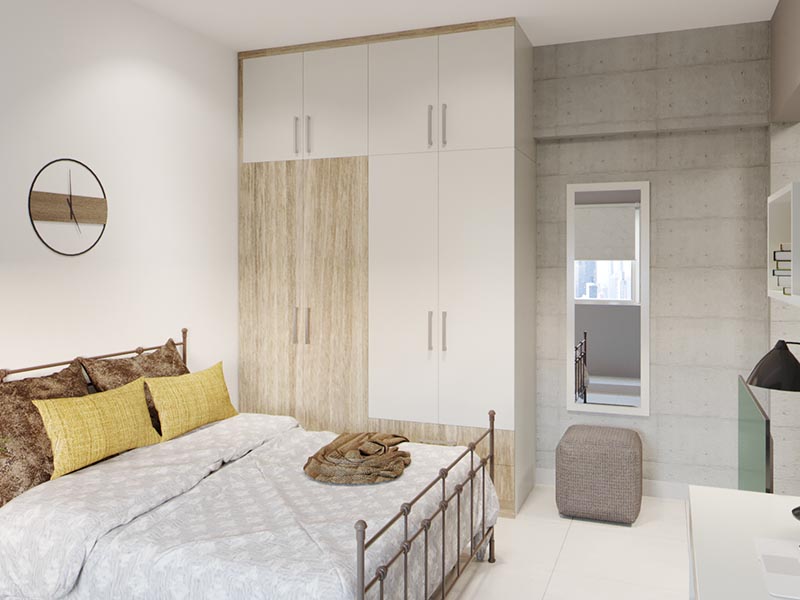 Love a look of understated elegance? Then this modular wardrobe design is just your style! Silky cream shutters combine with vertical grains of white cedar to lend this functional wardrobe a clean, minimalistic appeal. A long mirror to one side allows for all those last-minute dabs of lipstick on your evening out.