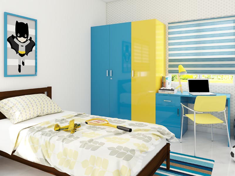 Yellow and Blue Hinged Door Wardrobe with Study Table
